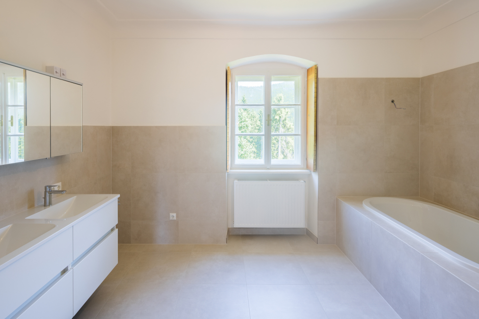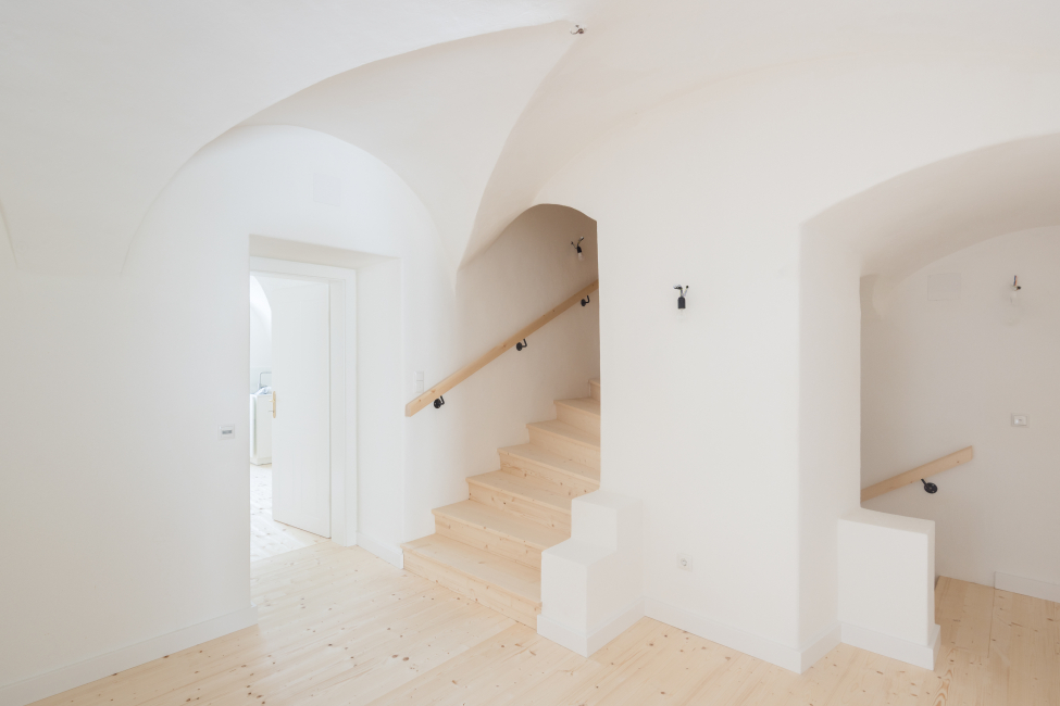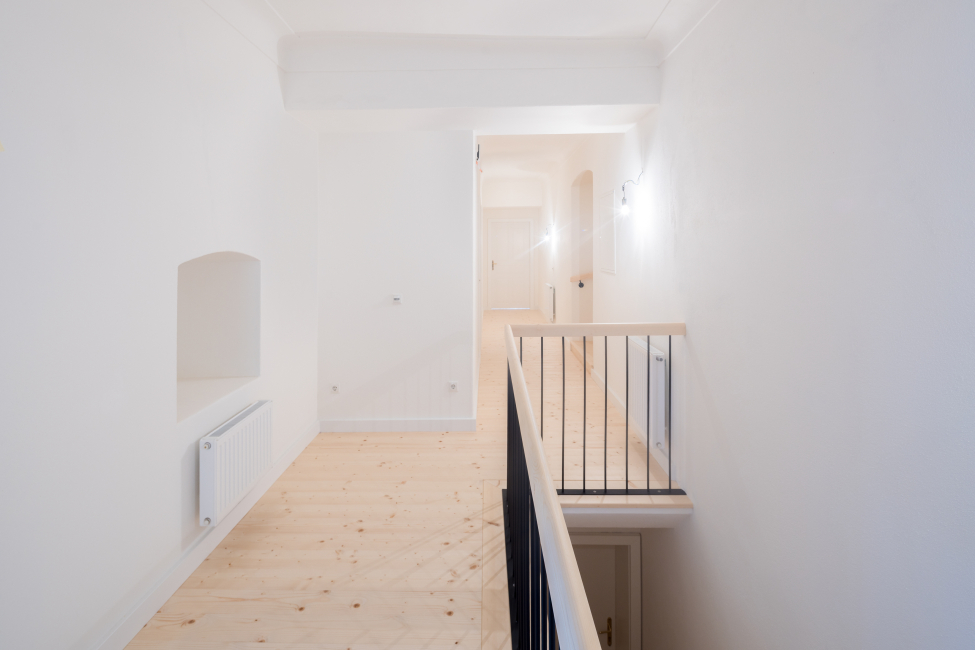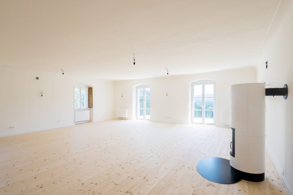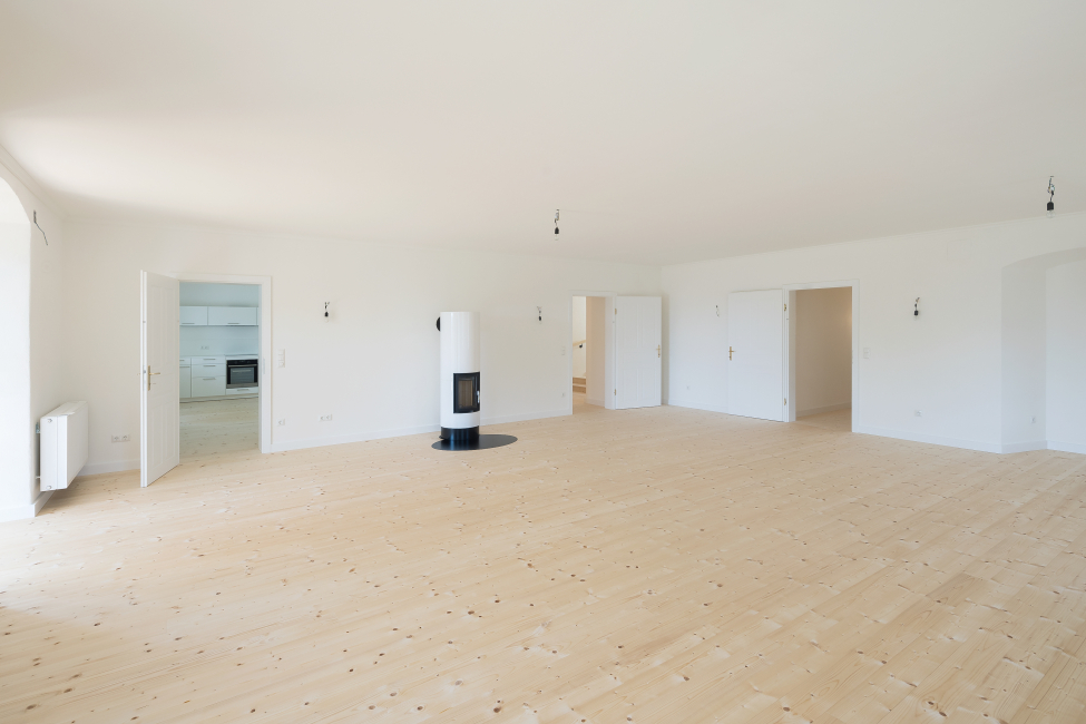 Im Zuge der Renovierung wurde eine neue Pelletsheizung zur Beheizung aller Wohnräume mittels Heizkörper installiert. In den Schlaf-und Wohnräumen wurden neue Fichtendielenböden verlegt und jedes Stockwerk verfügt nun über eine neue, vollausgestattete Küche sowie neu eingerichtete Bäder und WC´s. Die beiden rund 70 m² großen Hauptwohnräume bieten einen Ausgang auf den vorgelagerten Balkon. Vom Balkon, aber auch durch die licht- und sichtspenden Holzfenster der beiden großen Wohnräume hindurch, hat man einen schönen Blick gen Osten über die große Waldwiese und übergehend in die hügelige Waldlandschaft des Nordwaldes.