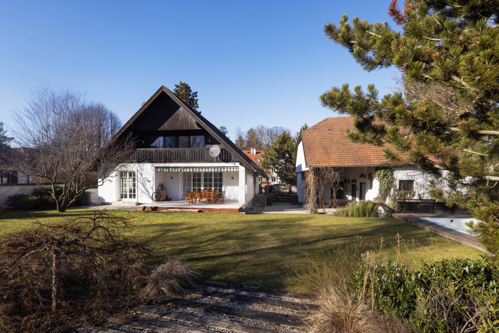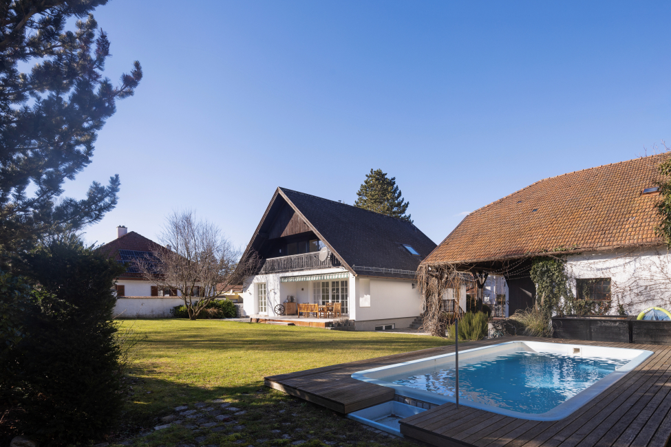 Der Garten verfügt über einen Pool, einen kleinen Hundepool sowie großzügige Grünflächen. Er wurde mit viel Sorgfalt gestaltet. Das Grundstück ist sowohl direkt von der Straße aus als auch diskret über einen zweiten Zugang begehbar.