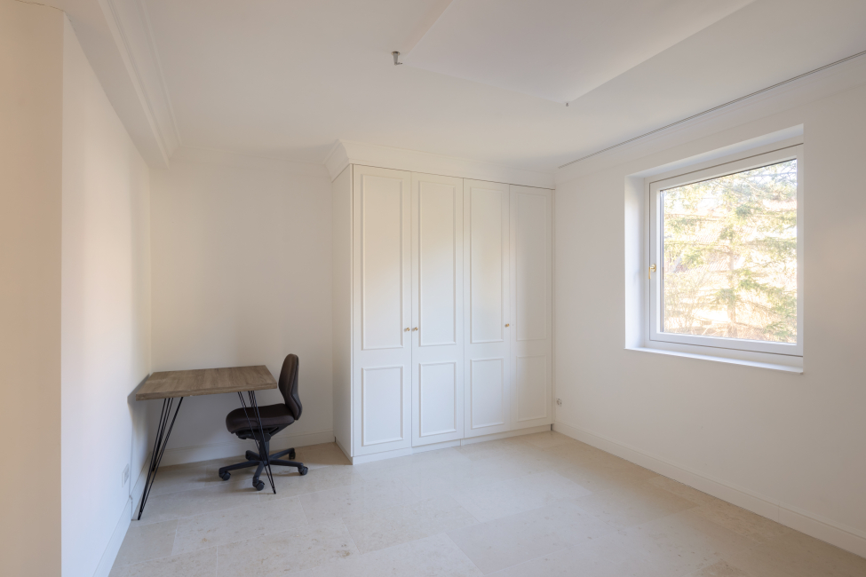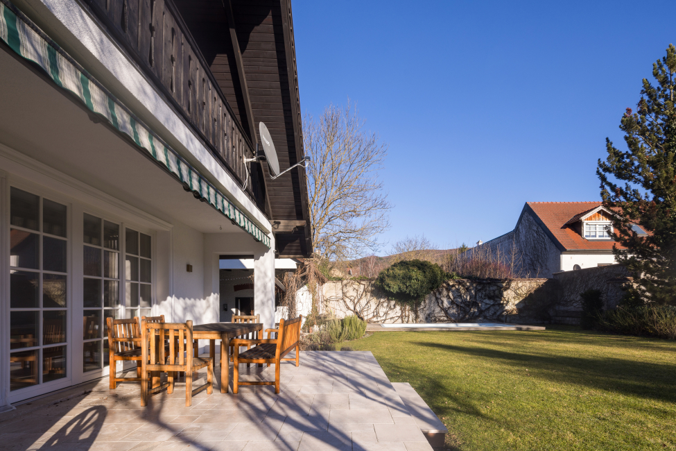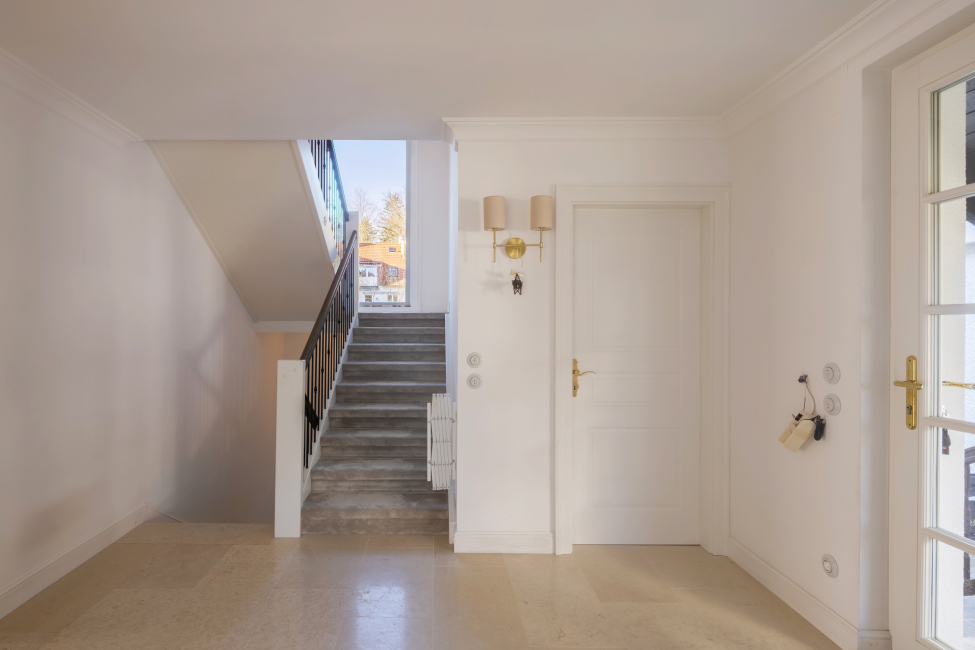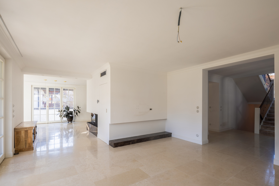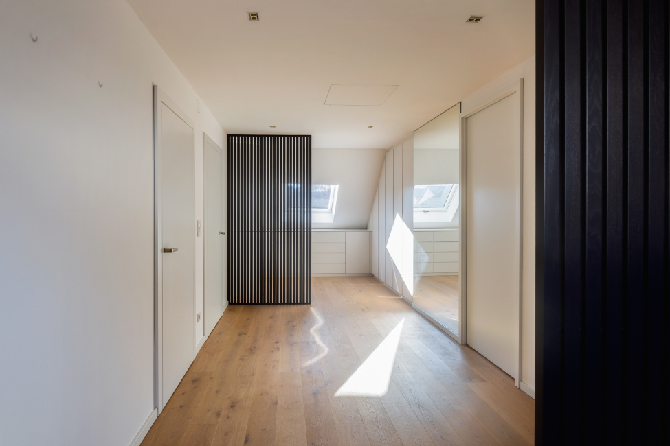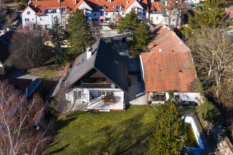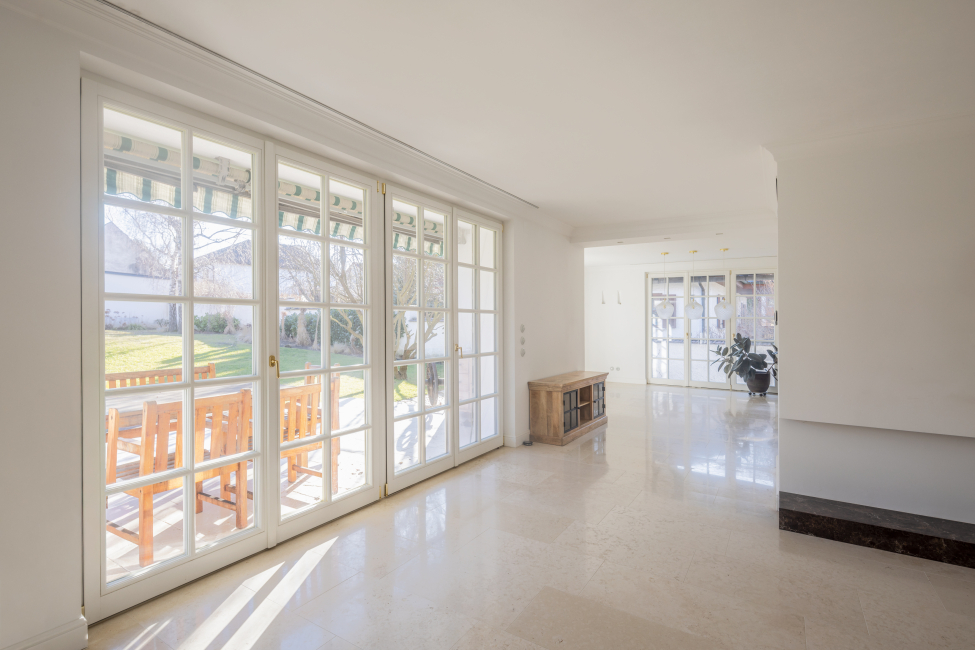 Beim Ausbau wurde darauf geachtet, sämtliche Wohnräumlichkeiten auf den südseitigen Garten auszurichten. Einzig das Bad, sowie das Büro befindet sich nordseitig und somit straßenseitig. Eine Klimaanlage ist sowohl im Erdgeschoß als auch im Obergeschoß deckenbündig installiert.