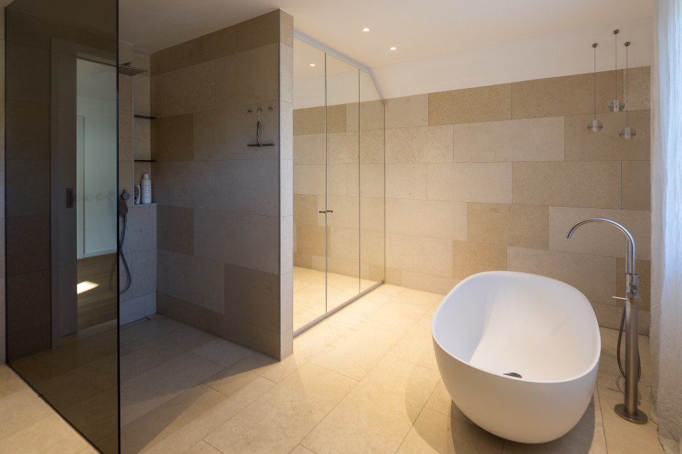 Das Entrée, sowie Wohnsalon und Küche sind mit einem hochwertigen Steinboden ausgestattet - durch die verbaute Fußbodenheizung erhält man eine angenehm gleichmäßige Wärmeverteilung.