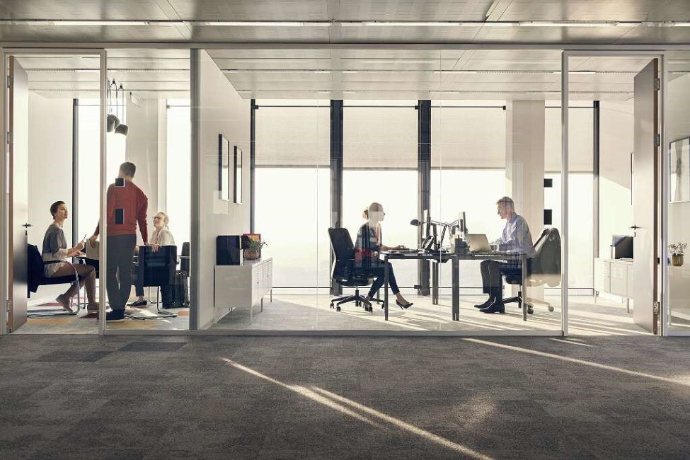 raised floor, carpet, district heating, passenger elevator, shower, basement garage, kitchenette, bicycle storeroom, cooling, plasterboard walls, glass walls, workplace-friendly lighting